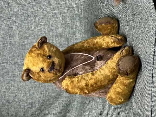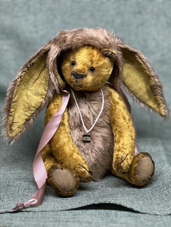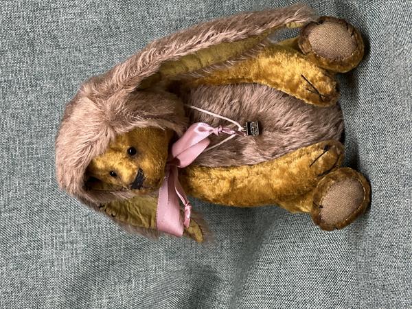 Introducing my whimsical Vintage-Style Teddy Bear with a touch of playfulness – a delightful 20 cm companion with a unique twist. This charming bear, crafted from vintage plush and luxurious German mohair, is not your typical teddy. What sets him apart is the adorable hat adorned with rabbit ears, adding a whimsical and endearing flair.