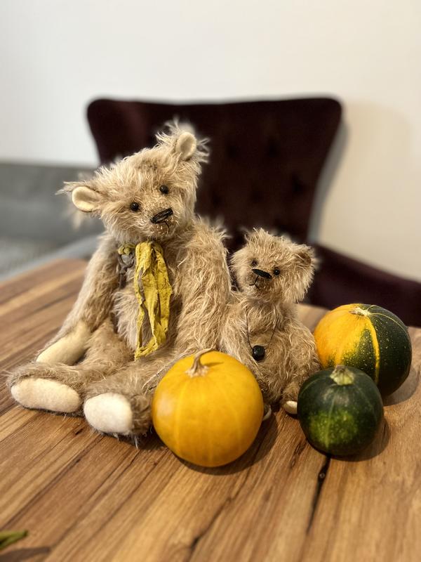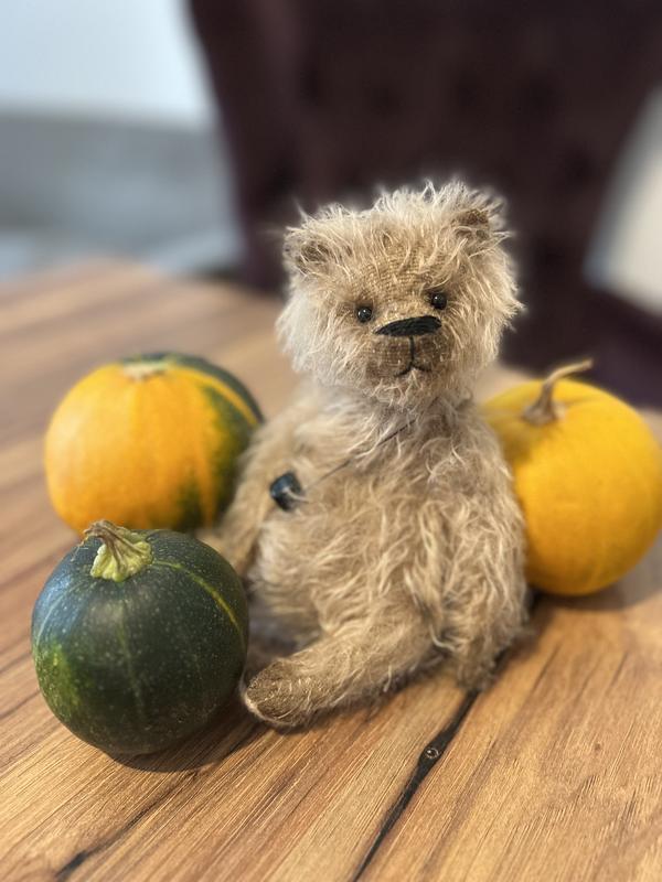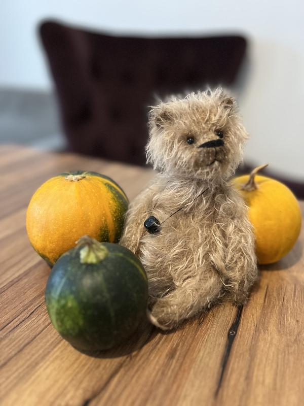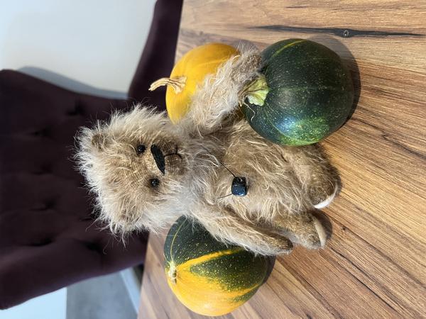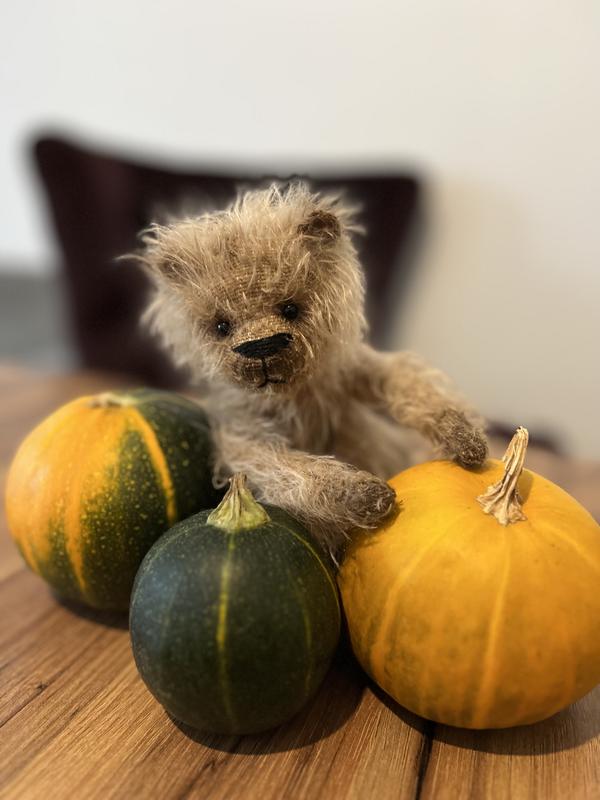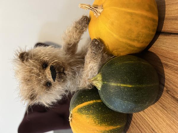 Pumpkin is a charming little teddy bear with a warm and inviting presence. His soft German mohair fur is incredibly luxurious to the touch, making him the perfect snuggle buddy for children and adults alike. At 18 cm long, he is the ideal size for cuddling and carrying around.