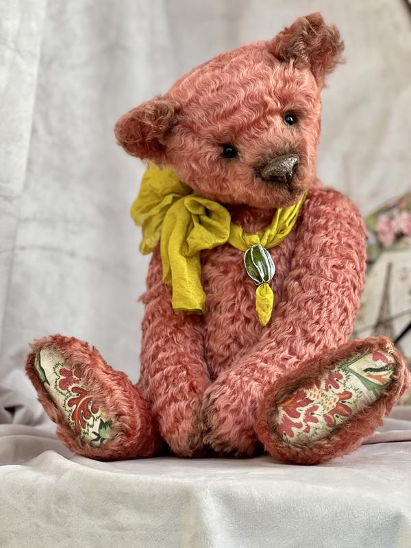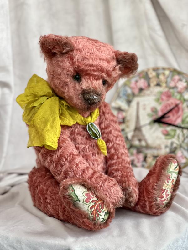 Adorned with a lace ribbon featuring a handmade ceramic button, Strelitzia's collar pays homage to the graceful branches of the Strelitzia flower. The color coordination with the floral print on the bear's heels adds an extra layer of sophistication and ties the entire design together.