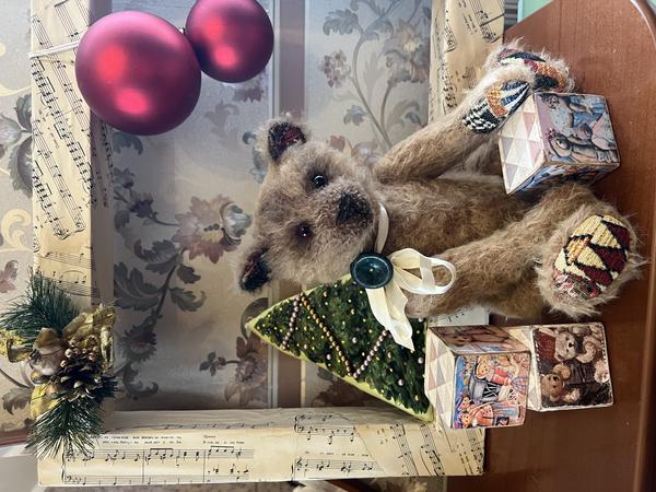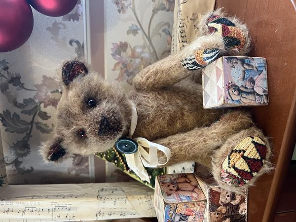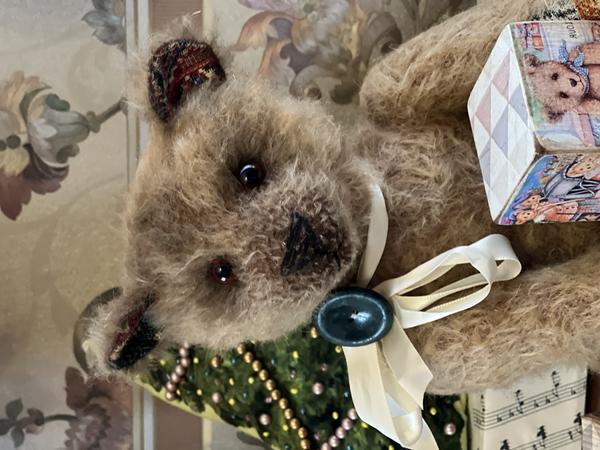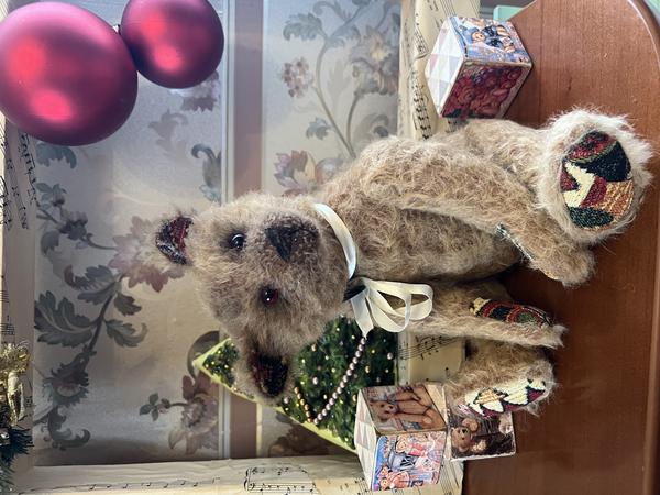Tom's glass eyes and embroidered nose bring a lifelike quality to his endearing face. His movable head and legs, expertly fastened with cotter pins, discs, and metal washers, allow for expressive poses that showcase the craftsmanship and attention to detail put into his creation.