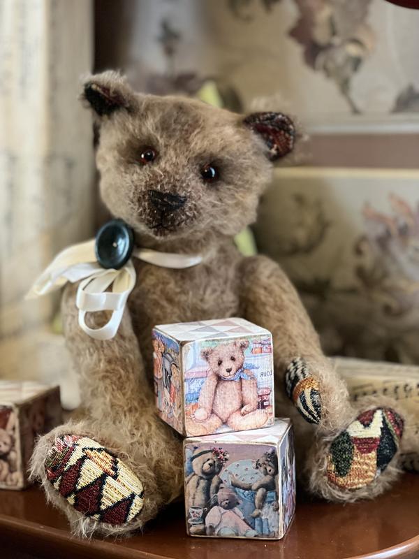 Tom has a soft belly, adding an extra touch of comfort and warmth to his cuddly nature. Adorning his neck is a ribbon featuring a vintage button, a timeless accessory that complements his classic design.